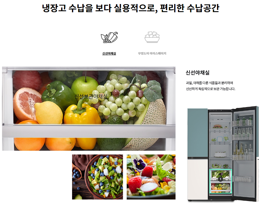 - 다양한 저장 공간: LG 디오스 오브제컬렉션 양문형 노크온 냉장고는 사용자의 편의를 최우선으로 생각한 식품 보관 공간이 다채롭게 구성되어 있습니다.