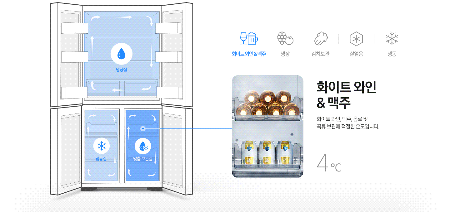 - 삼성의 Twin Cooling Plus™ 기술: 삼성전자 BESPOKE 냉장고 4도어는 냉장실과 냉동실의 온도와 습도를 따로 관리해 식재료의 신선도를 최대한 유지합니다.