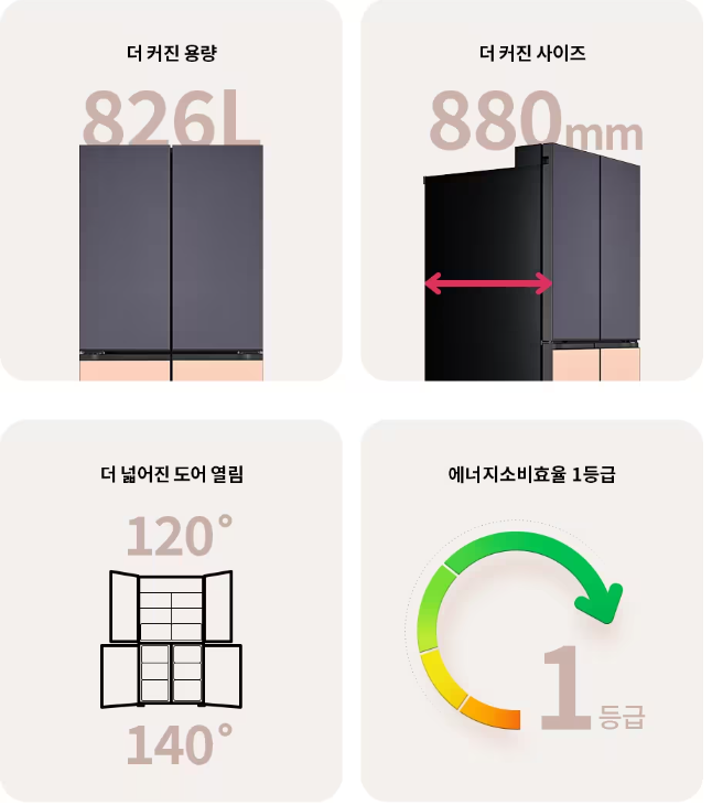 - 용량 : 삼성전자 BESPOKE 냉장고 4도어는 875리터로 대형 가정의 식재료를 충분히 담을 수 있는 크기입니다.