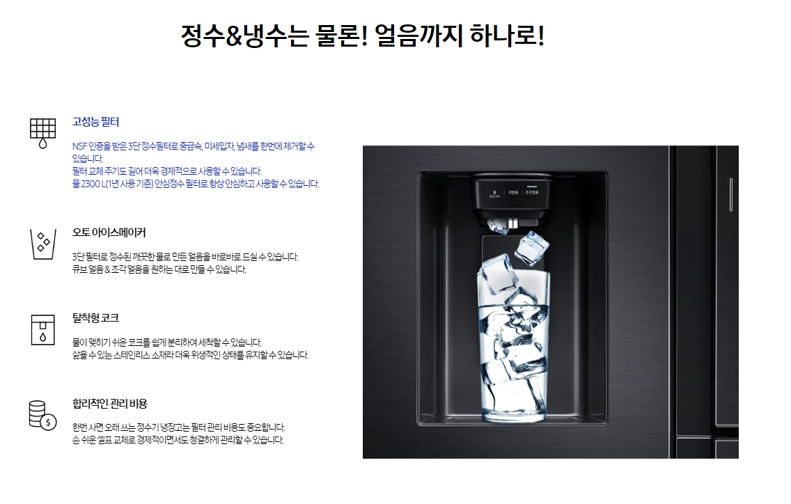 - 공간 최적화: 삼성전자 양문형 정수기 냉장고는 다양한 구역을 제공해 식 재료를 정리하고 보관하기 쉽게 합니다.