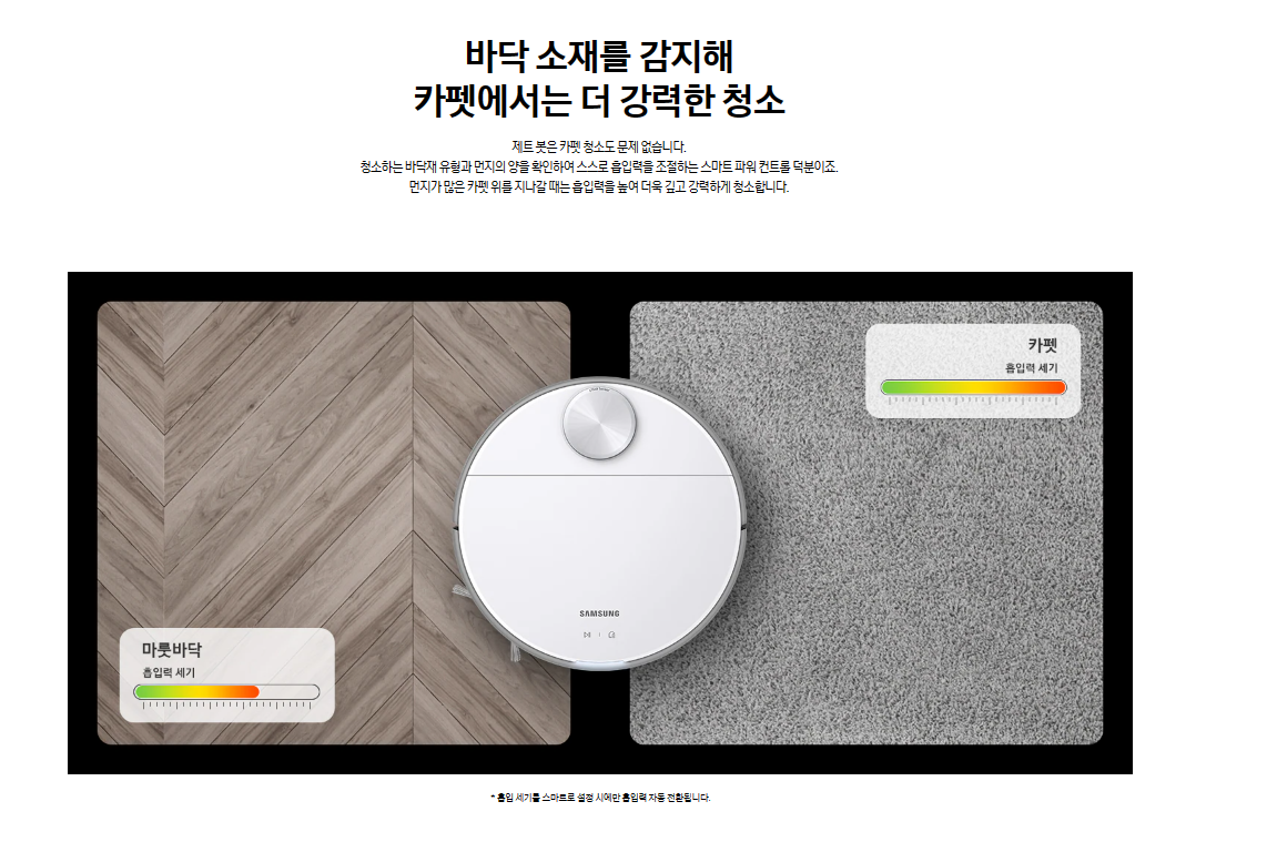 삼성 제트 봇은 강력한 제트 흡입력을 자랑합니다. 이로 인하여 필터에 먼지가 쌓이지 않고 미세한 먼지까지 철저하게 청소할 수 있습니다.