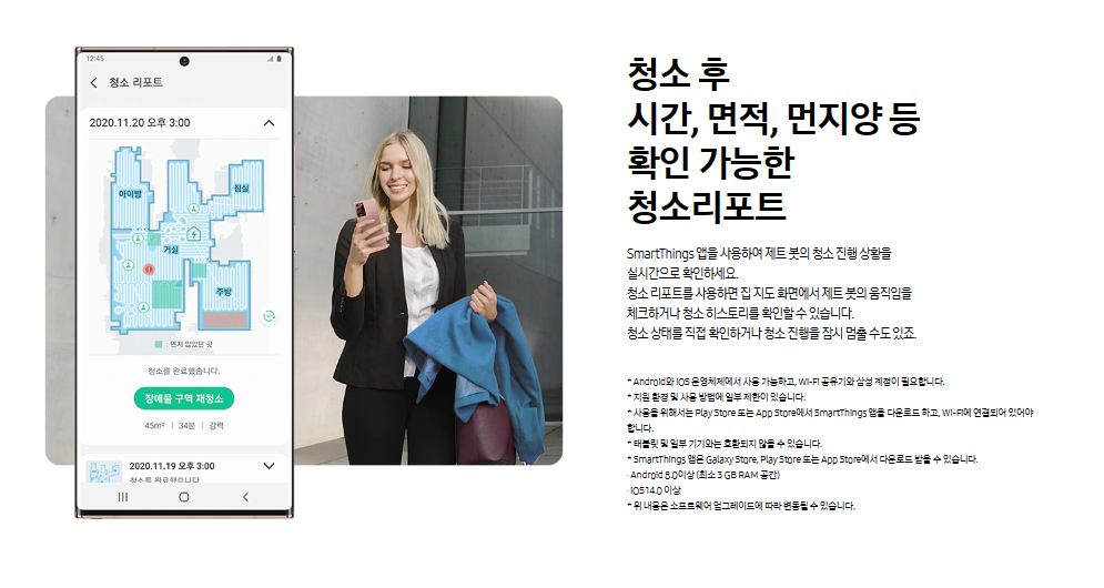 삼성동화 앱을 사용하면 휴대폰에서 제트 봇을 제어할 수 있고, 청소 경로, 스케줄, 작업 완료 알림 등 여러 가지 설정을 간편하게 할 수 있습니다.