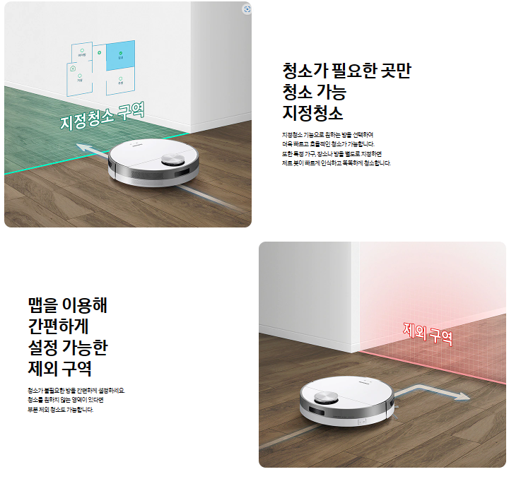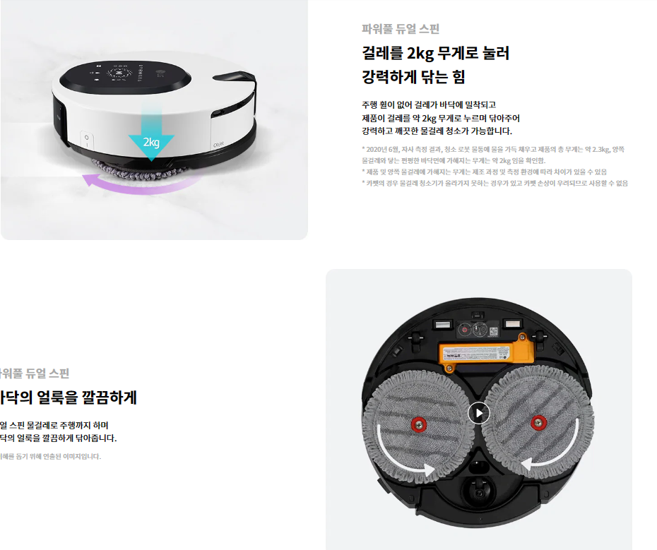 - 융합 청소 기능 : 융합 청소 기능을 통해 바닥과 물에 물걸레로 동시에 사용할 수 있습니다. 또한, 유동식 물탱크는 청소 농도를 제어하고 청소 시간을 줄일 수 있도록 도와줍니다.