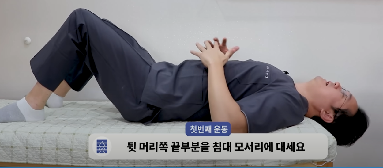 바로 위와 같이 침대 모서리쪽에 머리를 대고 5분동안 유지하는 방법입니다. 자연스럽게 목에 커브가 들어가 거북목 교정이 이루어지는데요 이때 주의할 점은 어지러움증이 발생 할 수 있으니 5분씩만 유지하는것이 좋습니다.