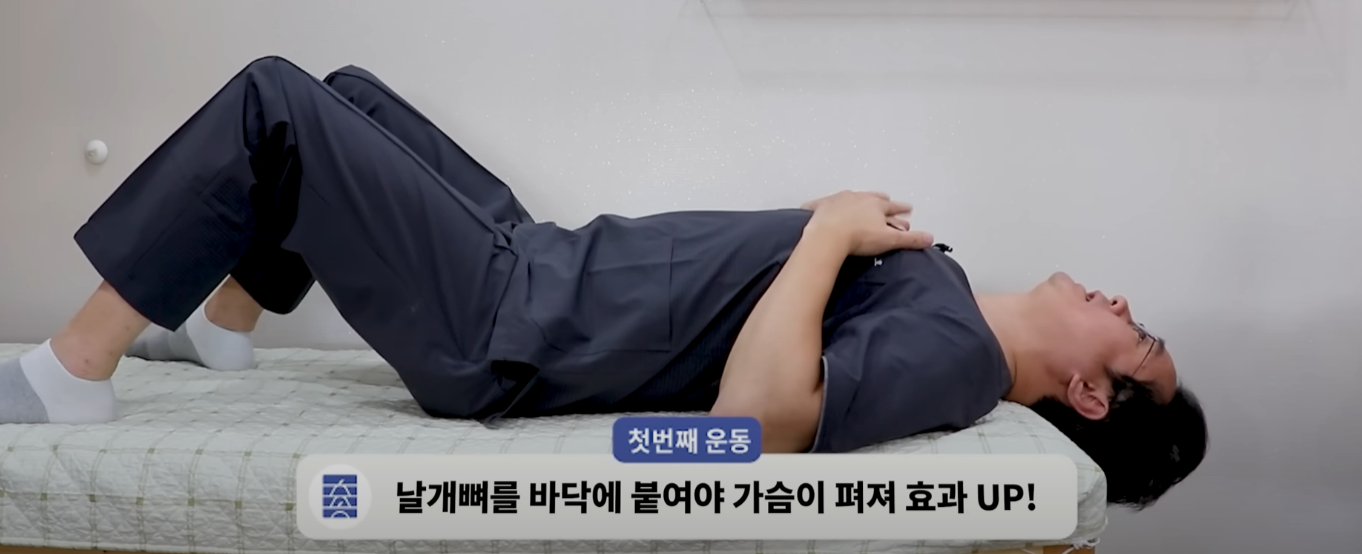 날개뼈를 바닥에 붙여줘야 효과가 더욱 좋아진다는 법!! 하지만 처음에 이 자세를 취하면 목에 부담이 많이 올 수 있습니다. 그러면 날개뼈를 붙이는것보다 목을 45도 정도 유지하는것에 중점을 두고 하시는것을 추천드립니다.